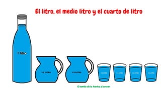 El litro es una forma especial de medir líquidos, como agua, jugo o leche. Es como una caja imaginaria que nos dice cuánto líquido hay dentro.